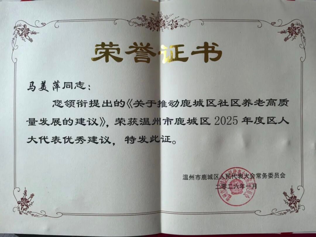 近日,鹿城区人大代表、av在线看 环境卫生与毒理学系马美萍副教授提出的《关于推动鹿城区社区养老高质量发展的若干建议》,荣获“2025年度鹿城区人大代表优秀建议”称号。